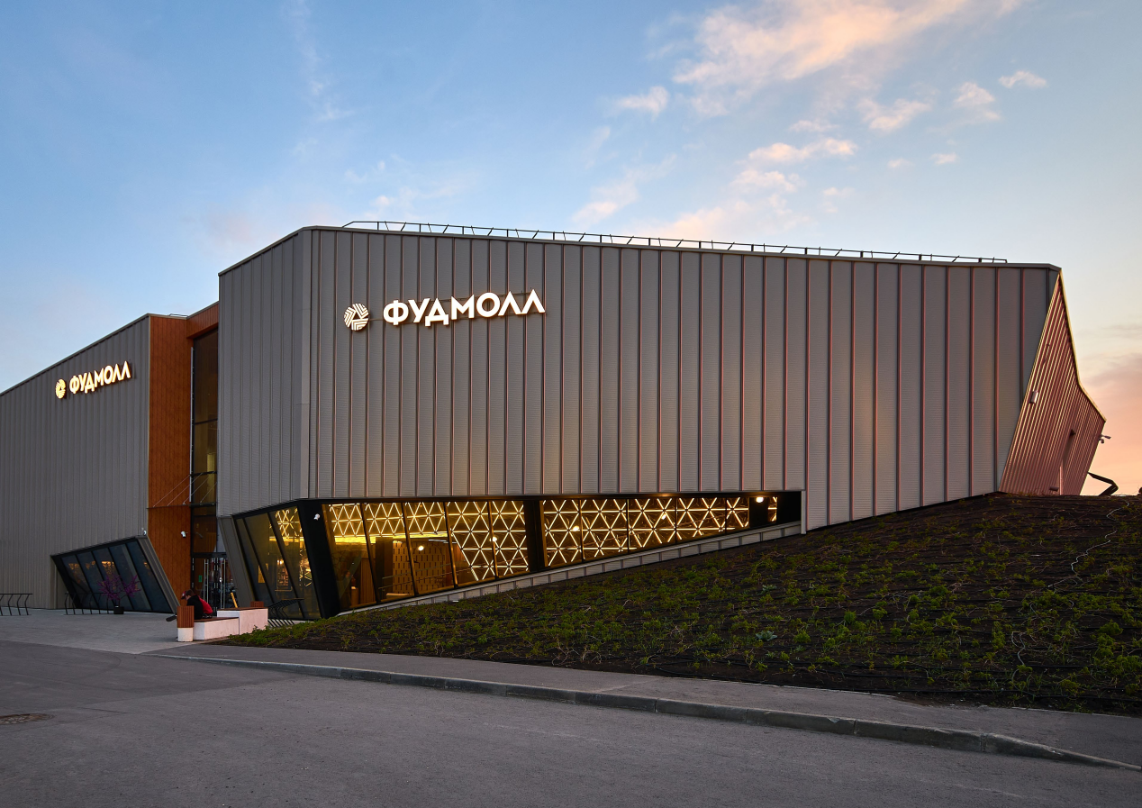 Архитектура «Фудмолл» построена на композиции из чистых геометрических форм. Фасадные решения подчёркивают строгий лаконичный образ комплекса. Здание имеет необычную многоскатную кровлю площадью 2 350 м2, которая переходит в облицовку фасада. Тем самым объект имеет своего рода пятый фасад, что делает его привлекательным со всех сторон, в том числе и сверху. Основные входные группы «Фудмолла» располагаются со стороны наземного паркинга и бульвара.